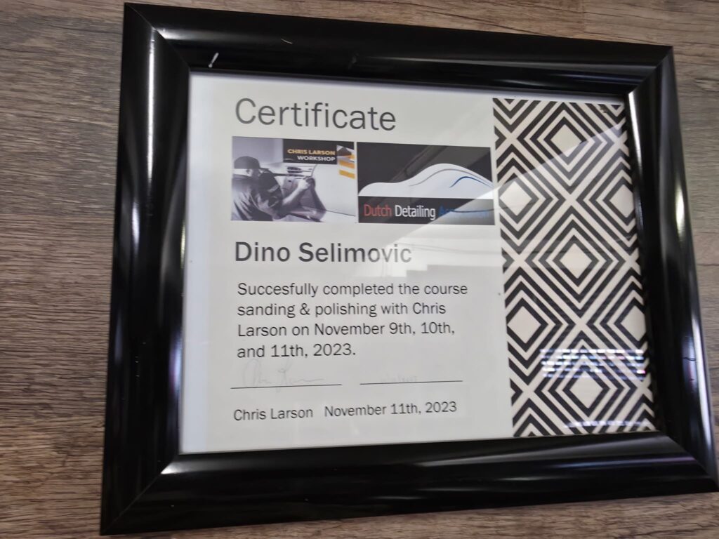 Ovaj certifikat potvrđuje uspješno završenu specijalističku obuku pod mentorstvom Chrisa Larsona, jednog od vodećih svjetskih stručnjaka u industriji detailinga. Program je bio fokusiran na najzahtjevnije aspekte restauracije eksterijera: Tehnike brušenja (Sanding): Precizno uklanjanje dubokih nesavršenosti i "narančine kore" (orange peel) s površine laka radi postizanja savršene teksture. Vrhunsko poliranje (Polishing): Primjena naprednih metoda poliranja za postizanje maksimalnog sjaja i zrcalne refleksije ("show car" finiš). Restauracija površina: Rad prema najvišim standardima struke, uz korištenje profesionalnih alata i tehnika koje osiguravaju dugotrajnu zaštitu i integritet laka. Edukacija u suradnji s Dutch Detailing Association jamči primjenu najmodernijih svjetskih standarda u njezi i održavanju premium vozila.